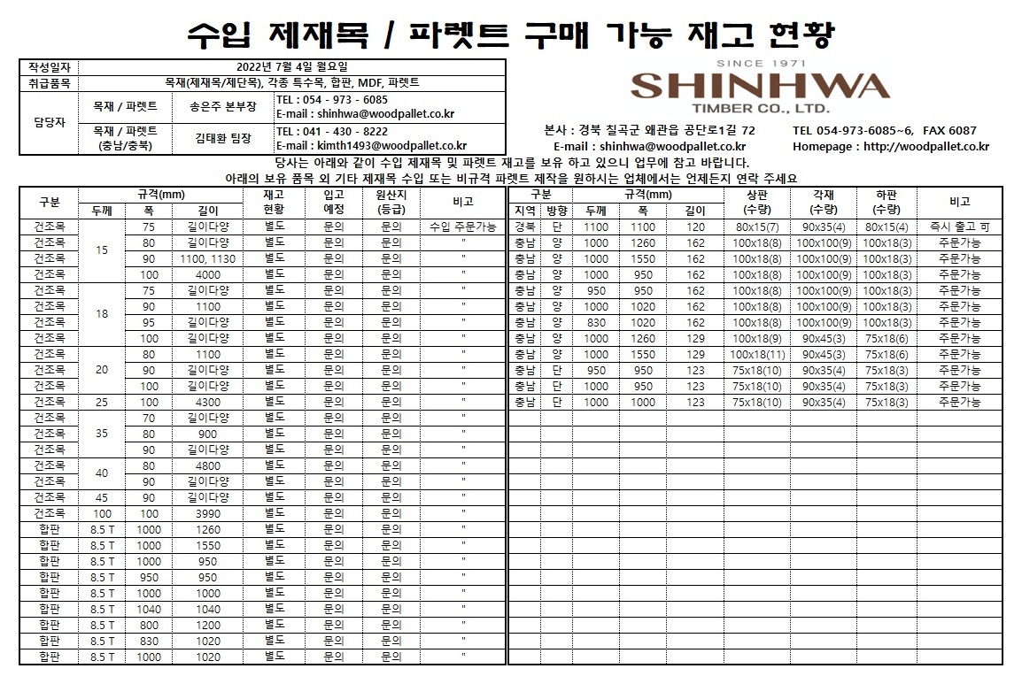 1. 당사는 수입 제재목 수입 전문 유통 및 목재파렛트, 수출용 포장재 생산 전문기업입니다.