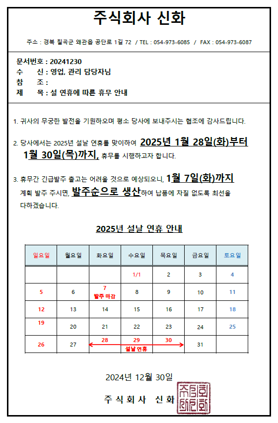2025년 설 연휴에 따른 발주 가능 일정 안내 페이지 정보 작성자 최고관리자 댓글 0건 조회 509회 작성일 25-01-02 11:11 목록 본문 2025년 설 연휴에 따른 발주 가능 일정 안내 이전글2025년 여름 하계휴가 안내 25.07.03 다음글2024년 추석 연휴에 따른 발주 가능 일정 안내 24.08.26 댓글 0 댓글목록 등록된 댓글이 없습니다.